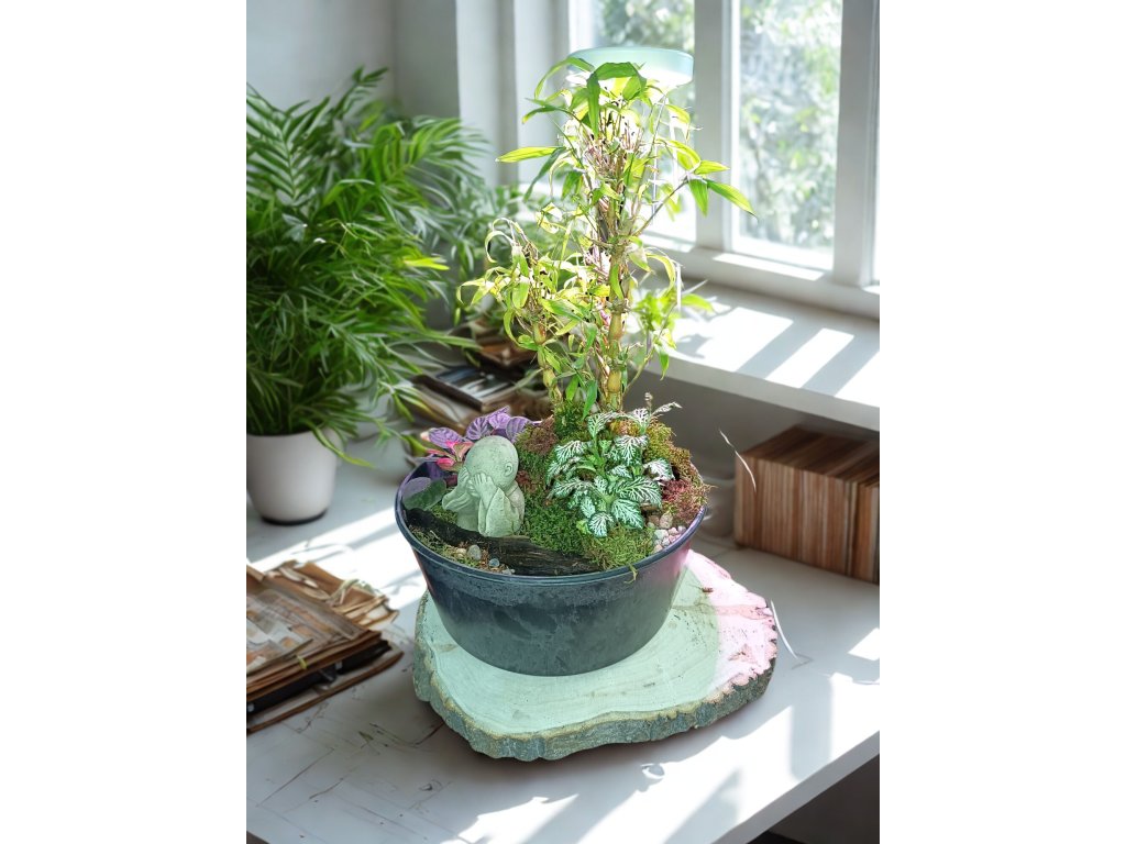 Dopřejte si kousek klidu v rušném dni s originální zenovou minizahrádkou. Ručně sestavená harmonie bambusu, fitónie a fialek vdechuje každému interiéru svěží život. Celé kompozici dominuje soška malého Buddhy, která s jemným nádechem roztomilosti ukrývá tvář a zároveň jakoby chránila Váš osobní prostor. Přírodní mech, dekorační dřevo a hladké kamínky vytváří žívý svět plný detailů, jež si okamžitě zamilujete.