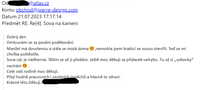 Sova-výr je nádherná. Těším se až ji předám. Ještě moc děkuji za přídavek-velrybu. Tu už si ,,sobecky“ nechám😊.