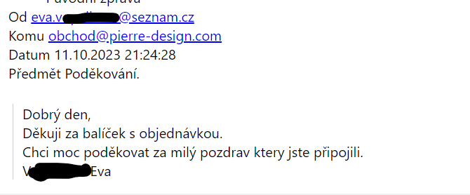 Děkuji za balíček s objednávkou.