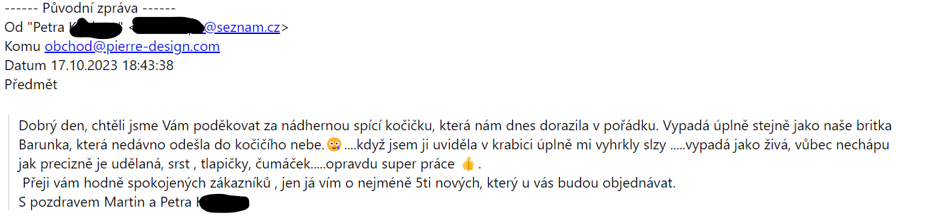 "Dobrý den, chtěli jsme Vám poděkovat za nádhernou spící kočičku, která nám dnes dorazila v pořádku. Vypadá úplně stejně jako naše britka Barunka, která nedávno odešla do kočičího nebe.🥲....když jsem ji uviděla v krabici úplně mi vyhrkly slzy .....vypadá jako živá, vůbec nechápu jak precizně je udělaná, srst , tlapičky, čumáček.....opravdu super práce 👍.