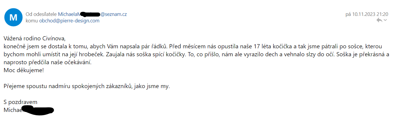 konečně jsem se dostala k tomu, abych Vám napsala pár řádků. Před měsícem nás opustila naše 17 léta kočička a tak jsme pátrali po sošce, kterou bychom mohli umístit na její hrobeček. Zaujala nás soška spící kočičky. To, co přišlo, nám ale vyrazilo dech a vehnalo slzy do očí. Soška je překrásná a naprosto předčila naše očekávání.