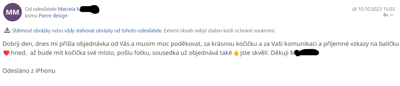 "Dobrý den, dnes mi přišla objednávka od Vás a musím moc poděkovat, za krásnou kočičku a za Vaši komunikaci a příjemné vzkazy na balíčku❤️hned, až bude mít kočička své místo, pošlu fotku, sousedka už objednává také👍jste skvělí. Děkuji M."