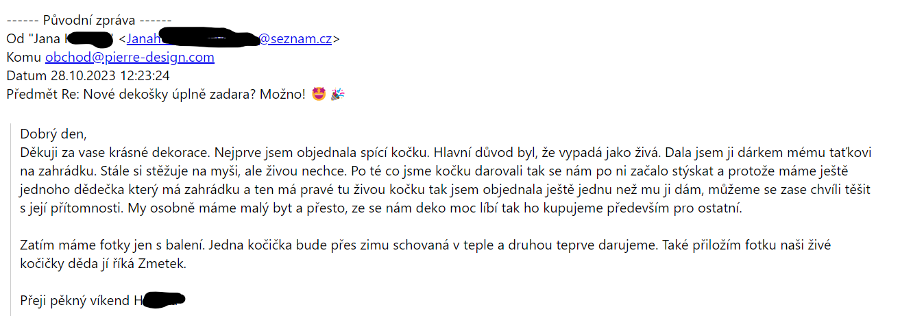 Děkuji za vase krásné dekorace. Nejprve jsem objednala spící kočku. Hlavní důvod byl, že vypadá jako živá. Dala jsem ji dárkem mému taťkovi na zahrádku. Stále si stěžuje na myši, ale živou nechce. Po té co jsme kočku darovali tak se nám po ni začalo stýskat a protože máme ještě jednoho dědečka který má zahrádku a ten má pravé tu živou kočku tak jsem objednala ještě jednu než mu ji dám, můžeme se zase chvíli těšit s její přítomnosti. My osobně máme malý byt a přesto, ze se nám deko moc líbí tak ho kupujeme především pro ostatní.
