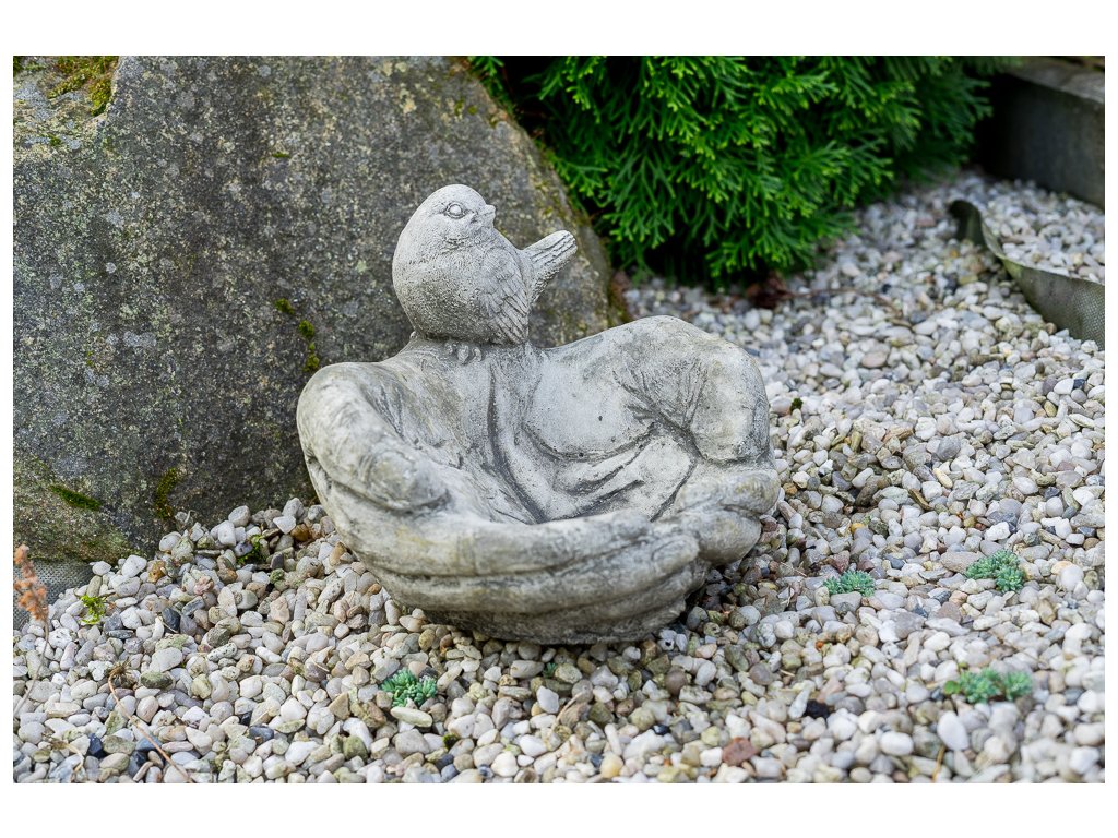 Betonové pítko pro ptáčky jako ruce, které tvoří misku. Nalákejte ptáčky tam, kam chcete.